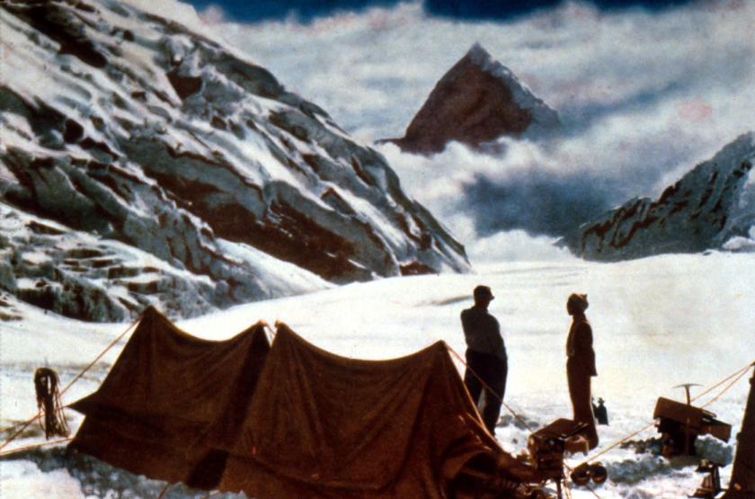 Lightweight tents were tested in a wind tunnel at RAF Farnborough. The bulk of the material was shot by expedition members Tom Stobart and George Lowe (the latter credited as director), both men given basic training on how to shoot cine film and supplied with cigarette packet-sized experimental cameras to use as the ascent progressed. There are no fancy infographics, the route mapped out instead by an anonymous hand wielding a magic marker on a monochrome drawing of the Himalayan landscape