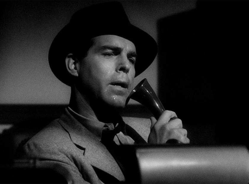 His car skids through an LA stoplight, then Walter Neff (Fred MacMurray) enters his insurance office in the small hours, taking a lift as if to the scaffold, coat hanging like a cloak, a dark stain on his shoulder. From his upstairs office, the desks below look like a hellish pit, the lamps insectile.