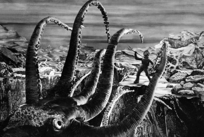 And, despite the apocalyptic subject matter, there’s a lot of goofy humour on display, from the rats scurrying to and fro in a ship’s bowels to a brief shot of what look like camels wearing roller skates. Stevenson rightly highlights an underwater scene featuring duelling pirates interrupted by a bicycle bell. And Zeman’s monstrous octopus is as spectacular as anything conjured up by Ray Harryhausen, predating by 60 years the animated sea creatures which enliven Wes Anderson’s The Life Aquatic.