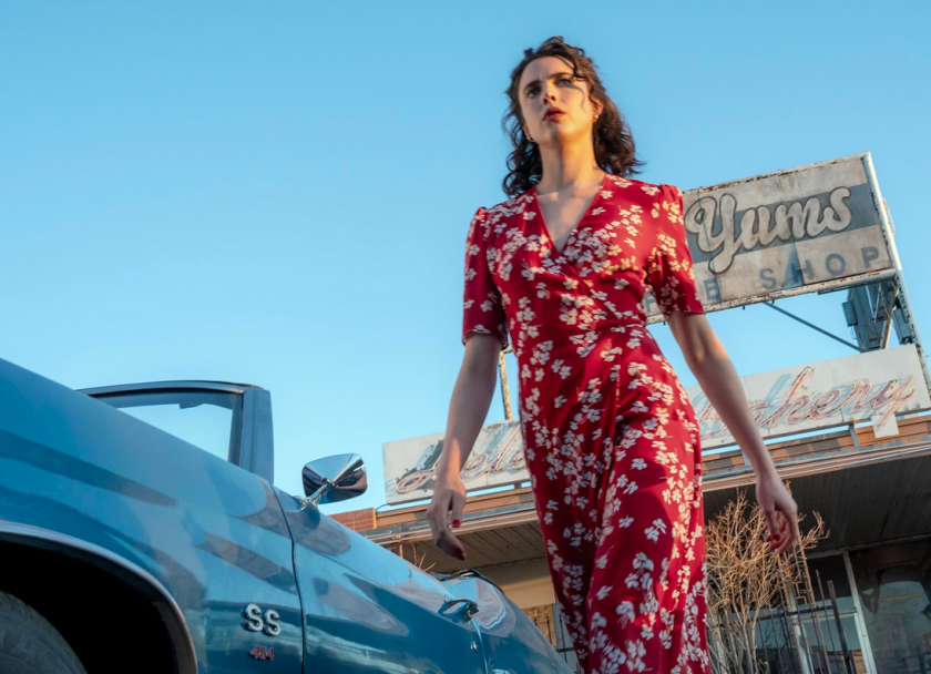 The main point of interest is Qualley’s detective, who saunters about this dirtbag burg in immaculate red frocks and heels (or sometimes Katharine Hepburn-style tan trousers), and makes a point of sleeping with every other lesbian in town. The world is Tarantino-retro, from Honey’s sprawling electric-blue convertible to the celebratory nod to New Queer Cinema of the 1990s.