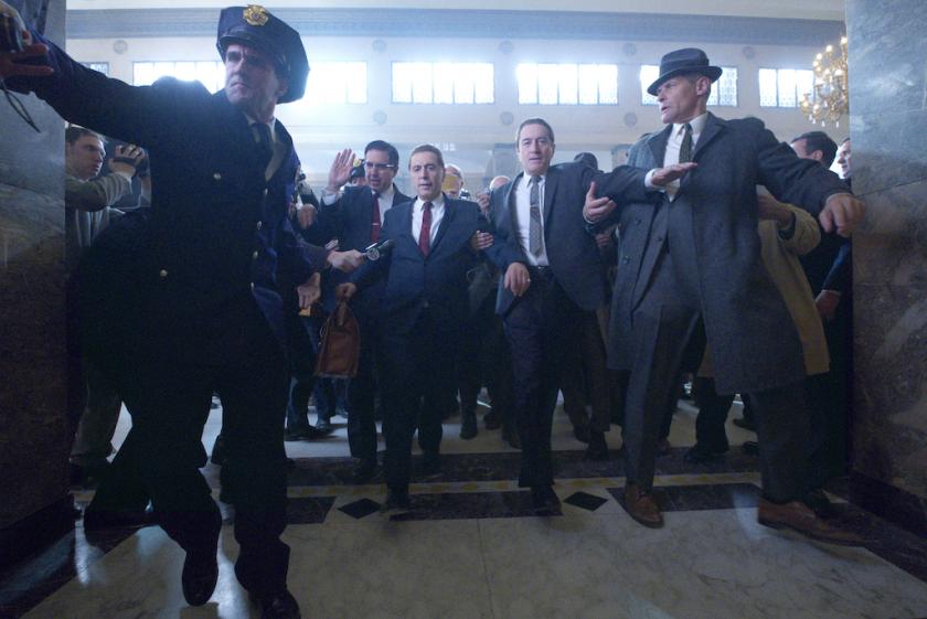 De Niro is Sheeran, who we first as the elderly resident of a nursing home, and through whose memories screenwriter Steven Zaillian (Schindler’s List, Gangs of New York) navigates his plot, principally from the late Forties to the Seventies. Returning from WWII as a “working stiff” with no direction but a nonchalant gift for killing, Frank’s life changes when he’s introduced to Mafia don Russell Bufalino (Pesci, pictured above left with De Niro). Russell employs him as a heavy and hitman, becomes his mentor, then lends his services to Hoffa (Pacino), the corrupt, fatally hot-headed Teamsters president.