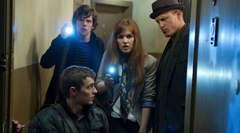 The set up is fairly straightforward. We meet four magicians - Daniel Atlas (Jesse Eisenberg) who does spectacular card tricks; street mentalist Merritt McKinney (a leering Woody Harrelson), who uses his hypnotic powers to scam punters for cash; Jack Wilder (Dave Franco), who bets his audiences that they can't work out how he does his tricks but still steals their money if they do; and Henley Reeves (Isla Fisher), who does magician-in-peril stunts like getting trapped in a tank of piranhas.