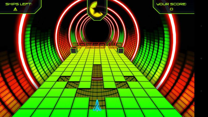 Each level is a variation on the same theme. Your little spaceship hurtles forward down a tiled path. Some of the tiles are missing, some contain powerups to boost your score or grant temporary powers like a shield, or incorporeality, and some are raised blocks that will destroy you on contact. You can steer left and right but not slow down. Every so often a voice will say 'Speed Up' and you will. That's it.