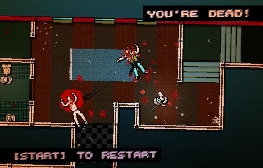 It’s a great setup to a game which takes its neo-pulp heritage seriously, and its pixelated arcade violence to the extreme. You play a hired killer cutting a bloody swathe through the Miami underworld at the behest of innocuous phone messages. These jobs are as innocent as babysitting, or attending a medical check-up; however, once you’ve driven (in your DeLorean!) to the specified location, and found it stuffed full with enemies who may or may not be über-criminal types, the real job is made perfectly clear. Kill. Everyone (as pictured below).