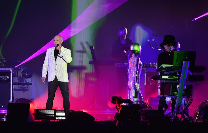 Burning off the sugar is a spectacular set from headliners Pet Shop Boys. “We’re going to have some hits, some dance tracks, some guests,” announces Neil Tennant, sporting a shiny, glittery pinstripe jacket. “Let’s get going!” Tennant is in an incredibly chipper mood, shouting out “Hyde Park!” at frequent intervals, and even the famously stony-faced Chris Lowe is caught with a wry smile on his face more than once. A troupe of fantastic dancers make the show even more special, sporting silver body suits and helmets, animal skull masks and, best of all, inflatable sumo-style suits in various colours. “Another old song… but which one to choose?” muses Tennant archly before a gloriously joyous “Go West”, with the multicoloured sumo dancers marching in formation behind him.