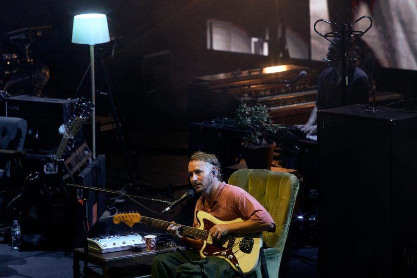 It’s reassuring to see the singer curled like a fern over his guitar, singing about the countryside, vivid scenes and the peculiar characters he has created. Improvisational noodling and repetitions appear, with lyrics that weren’t standout on the studio album becoming stark and glistening. In “Rumble Strip” the lines “I heard your voice / Somewhere between dark and dawning / Between moon shadow and morning / I heard your voice” are like diamonds amidst the rubble as he sings so intently, to no one – not even to the audience, coiled as he is around his music. Similarly, in “Metaphysical Incantations” he’s dialled down the heavy electro production and turned up the tinkering, emphasising the line “tell her to come and visit me”; “Sage That She Was Burning” is way more mellow and brooding than the progressive jazz vibe of the album.