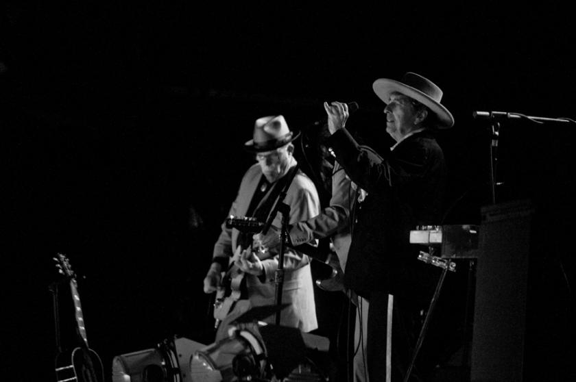 In early years Dylan hid behind his guitar and harmonica brace. In more recent times, he has tended to stand modestly side of stage while stabbing at his Korg keyboard. Yet here he was centre stage with nothing but the microphone to shield him from us, striking his theatrical poses and ad-libbing the lyrics to "Things Have Changed", the song he wrote for the film The Wonder Boys.