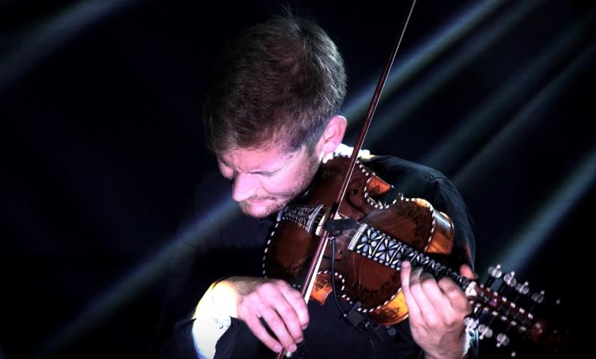 A fiddle projects upwards from between Erlend Apneseth’s knees. Seated, he holds another in his right hand facing-off the instruments against each other. He’s plucking both, the pizzicato pitter-patter suggesting water drops on a bell or a koto. On the other side of the stage, guitarist Stephan Meidell is looping the sound, treating it to form a wash akin to that of a waterfall. In between, percussionist Øyvind Hegg-Lunde is behind a drum kit rattling and scraping what looks like a cheese grater attached to some allen keys.