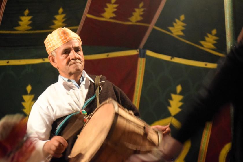 For this reason, Joujouka isn't strictly speaking a festival, although it's billed as such. There's no adequate word for what is really a healing ceremony, shared by players and guests alike. This collective and intimate experience reaches its climax at the end of every night of playing, when the musicians dress up and play the music for which Joujouka is most famous: 9 of them play raitas, double-reeded instruments designed for outdoor rituals and parties, common to most cultures from Central Asia and India through to Spain and Brittany. To say that they are loud is an understatement. Accompanied by five tabel, a drum often associated with this immensely powerful wind instrument. It’s known as a daouli in Greece, where it's almost always played by Roma musicians, and is beaten with a wooden stick in the right hand and a switch on the left, combining low and high pitch to explosive effect.