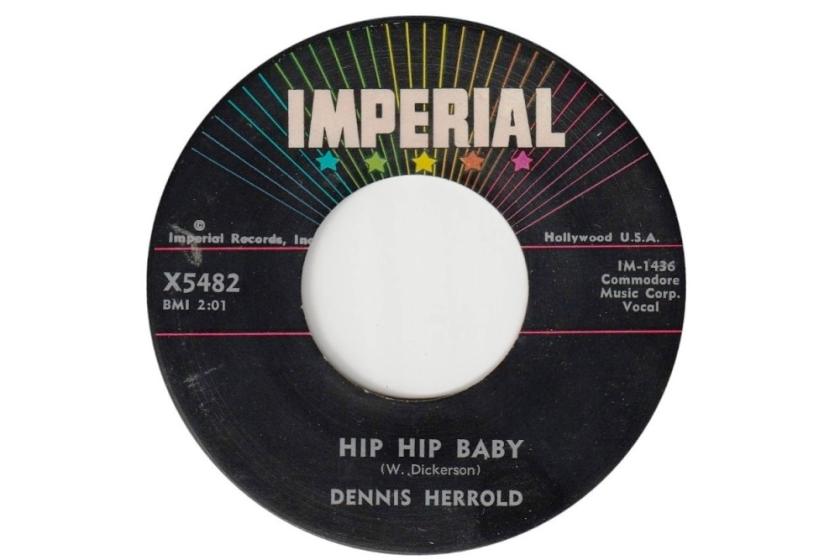 Unwittingly and likely unknowingly, Dennis Herrold (pictured left) was caught up in the booming interest. In the early Seventies, bootleg compilations began featuring his single as it was becoming collectable after being played at rock ’n roll events. Both his sides subsequently received their first legal reissue on two great, seminal-for-real British comps – 1977’s Imperial Rockabillies and 1979’s Imperial Rockabillies Volume Two. Since then, “Hip Hip Baby” and “Make With the Lovin'” have cropped up on at least 25 rockabilly comps. The original single sells for up to £350.