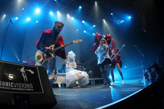 In a parallel with the economic world, Luxembourg's homegrown music can be seen as an emerging market. Some of the non-Luxembourg acts at Sonic Visions were tough competition. Switzerland's Bonaparte are a costumed, always moving, mind-numbing, post-rave quasi-freakshow that have forgotten to write any songs. Whatever the shock value, this circus was overwhelming, relentless and ruthlessly professional. Also nodding back towards rave were Belgian duo Vermin Twins (pictured left), little more than a laptop bloke and a dancer. More interesting and fun were China's Pet Conspiracy, a half-female, half-male quartet fronted by Helen Feng, Time Out Bejing's 11th coolest local rock star (pictured below). The complete article, Pet Conspiracy were full-on and engaging. With dashes of CSS and Yeah Yeah Yeahs, and blobs of synth pop, they're a fine ad for what China might have on offer.