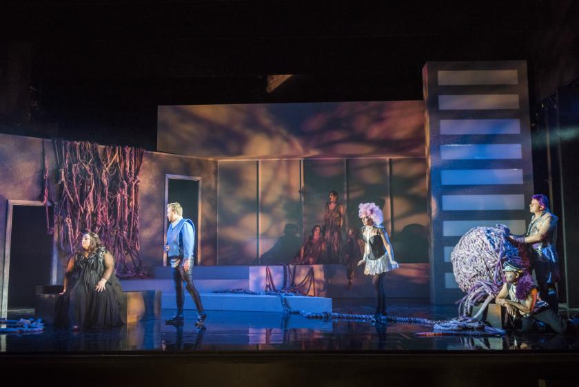 It’s a pleasure to hear Negus in something other than WagnerPresland sings radiantly apart from a tendency to croon on high sustained notes. And all the minor functionaries in the Prologue are incisively portrayed and strongly sung, notably Harry Nicoll as the comedians’ director (Dance Master) and  Darren Jeffrey as the Composer’s Music Master. The Norn-like Naiad, Dryad and Echo in the opera (Suzanne Fischer, Flora McIntosh, Alice Privett) sing sweetly and even have a Wagnerian rope, perhaps for boating as much as destiny-control. After all we are on an island, there are nets and fishing tackle, but alas, as usual in marine operas, no sign of the sea.