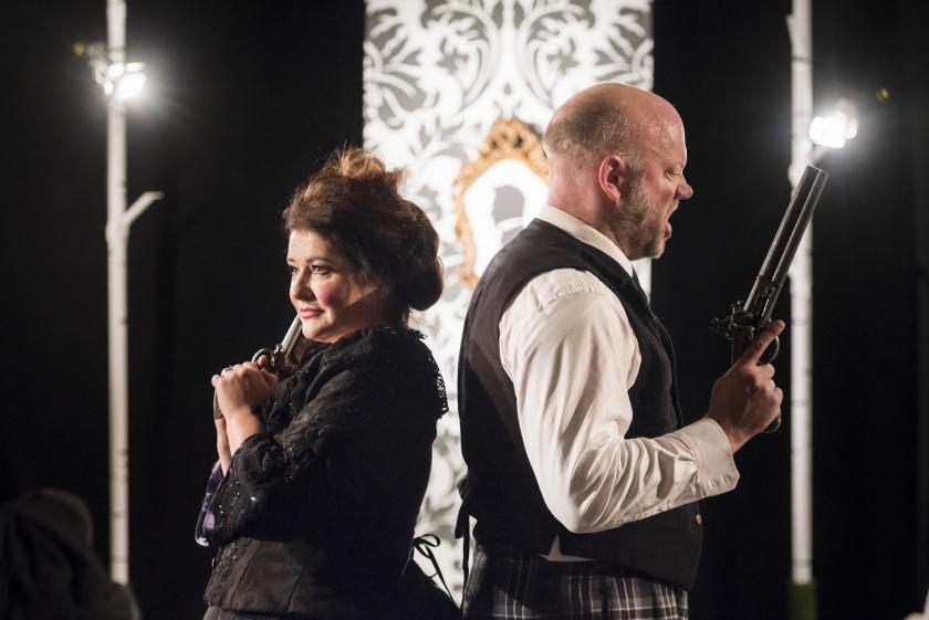 With Matthew Buswell (pictured above with Carolyn Dobbin) playing the servant Luka as an embattled voice of reason (his measured singing made a droll contrast to his mounting catalogue of injuries: collateral damage in Smirnov and Popova’s increasingly excitable clashes), there was more than enough humanity here to make Chekhov’s caricatures live. Studer’s direction didn’t stint on physical comedy, either: the characters brandished chairs, swigged vodka and jumped on furniture with exuberant enthusiasm and as much dignity as can be maintained when you’re wearing a pair of purple plaid trousers. The set comprised little more than a swatch of wallpaper, a patch of astroturf and some lighting stands that doubled as stylised birch trees – necessary for a production designed to tour small venues ranging from village halls on the Lleyn peninsula to the Ammanford Miners’ Theatre.