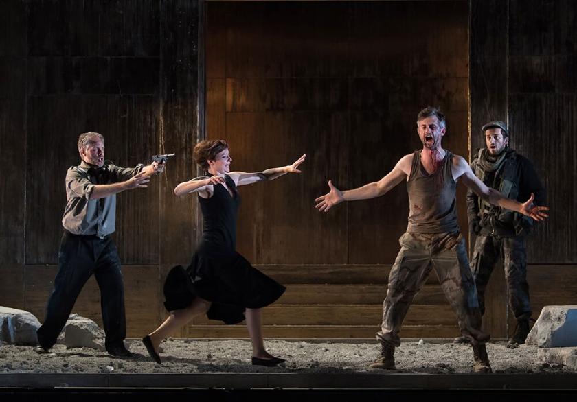 Venus and the soothsayer notwithstanding, the libretto fits well into the modern-day setting of Douglas Rintoul’s production. The single set (designer Cordelia Chisholm) is a concrete bunker in an unnamed warzone: the desert fatigues and copious sand suggest the Middle East, but we’re not told. The various settings are distinguished with modest lighting effects (lighting designer Mark Howland), and offstage gun battles are similarly evoked through flashing lights across the back of the set.