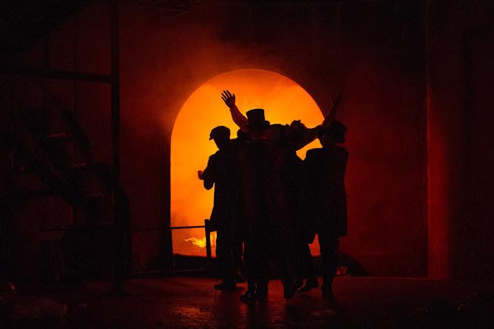 The curtain is up for the overture to English Touring Opera’s new production of Don Giovanni, but no-one is on stage. Instead, we gaze at Anna Fleischle’s set: a creation in two layers. On the top, elegant Klimt panels glint with gold. Below, and joined to the opulence above by a rickety looking metal fire escape, is a Piranesi-like underworld of drab brick, archways and mysteriously curving passages – perfect for lurking or throwing sinister shadows.