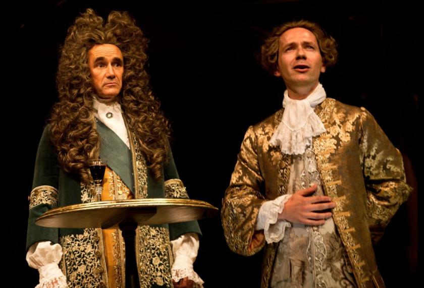 The supporting cast is good at best (Melody Grove’s wise Isabella, Colin Hurley’s testy librettist Metastasio and Edward Peel’s music-resistant courtier De la Cuadra). We’ve all really come, though, to see the most spellbinding actor of our stage, Mark Rylance (pictured above with Grove), as the bipolar king. He effortlessly throws his book of engagement, his seemingly improvised hesitations and his charm at us from the start, making us believe he’s sane while all around are mad, at least until violence briefly erupts. There are some nice lines about the parallel, unsought-for kingdoms of the ruler and the singer, near-poetry about the music of the spheres and a few laugh-out-loud moments (Farinelli’s composer brother Riccardo, who supposedly gave his sibling the snip at the age of 10, becomes “Rick the Knife”). But the richly-worded world of Johnny “Rooster” Byron or Richard III it isn’t.
