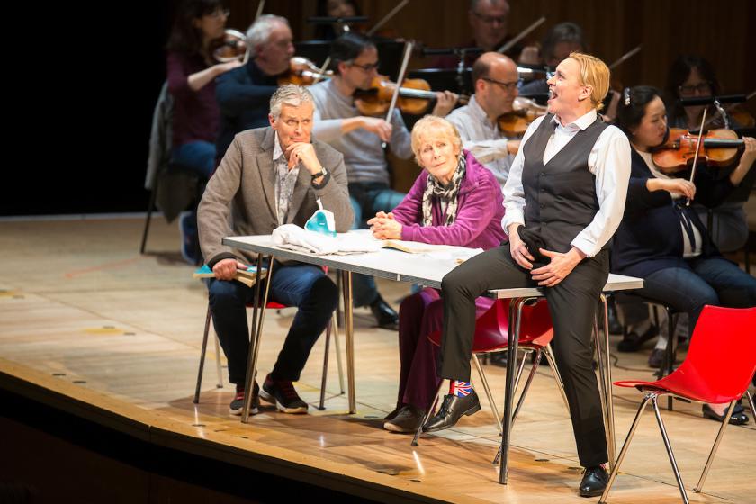 In a triumph of concept over content, Slater’s semi-staging opened with the orchestra in mufti, tea urns, props tables and costume racks strewn distractingly across the stage. We were witnessing a “rehearsal” of Fidelio, rather than Fidelio itself, complete with two actors (Helen Ryan and Simon Williams) who replaced the opera’s original dialogue with a series of meta-theatrical interventions, wandering through the action and delivering a commentary with aspirations of profundity (“Fear is passive; hope is active”, “Why do good people follow bad orders?”).
