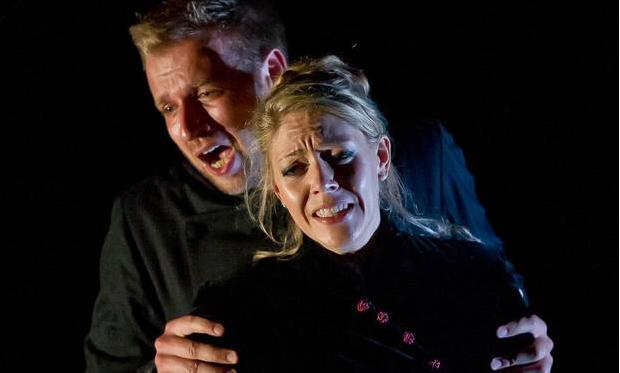 In six short scenes the opera follows the relationship between the Duke and his Duchess from passionate love through infidelity (hers) and eventually to murder (also hers, and her lover’s). It’s a quick collapse that wastes no time on practicalities. Sciarrino’s scuttling musical motifs give us thoughts in their natural state – jerky, occasionally jarring and often half-formed – allowing him to cut straight to the emotional business. The result is instinctive and surprisingly flexible. A duet between the Duchess (Amanda Forbes, pictured below right with George Humphreys) and the Guest (William Towers) is quietly erotic, exploiting the timbral closeness of the soprano and countertenor voices and occasionally placing the male on top of the texture as the two writhe and coil musically among one another.