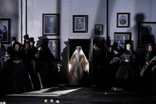 Indeed, the look of it is what will stay with me. Brigitte Reiffenstuel's grey-black crinolines and suits, reflected in the photographs on the walls and always intelligently grouped in Edwards's sets, give a menacing air to the nuptials, relieved only by the cream-coloured swank of the wealthy bridegroom and his men. Later the revellers go briefly wild, dancing a polka in the only hyperactive part of the late, lamented Claire Glaskin's creepy, disciplined movement.