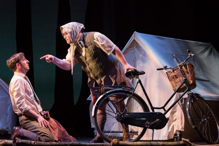 Familiar components bring some reassurance. The usually unsung hero of the Savoy spirit is music director and lone pianist Richard Baker: sprightly, rhythmically intense, supremely elegant with ornamentation, always there for his singers. The choruses especially, both masculine and feminine, truly zing, with well-trained voices throughout the company. And the miracle of femininity is also the best in the dialogue: as before, Alan Richardson in the Prima Donna role (pictured below). A beautiful sound it isn’t, but he hits the high notes full-on and his Yum-Yum actually manages to be touching as well as believable. Perhaps the one number in which the tents and the camp fire provide a trenchant context is in his/her duet with Nanki-Poo, "Were you not to Ko-Ko plighted"; the notion of kissing tenderness being “beyond the law” has a certain piquancy if you get the (early) 1950s setting.