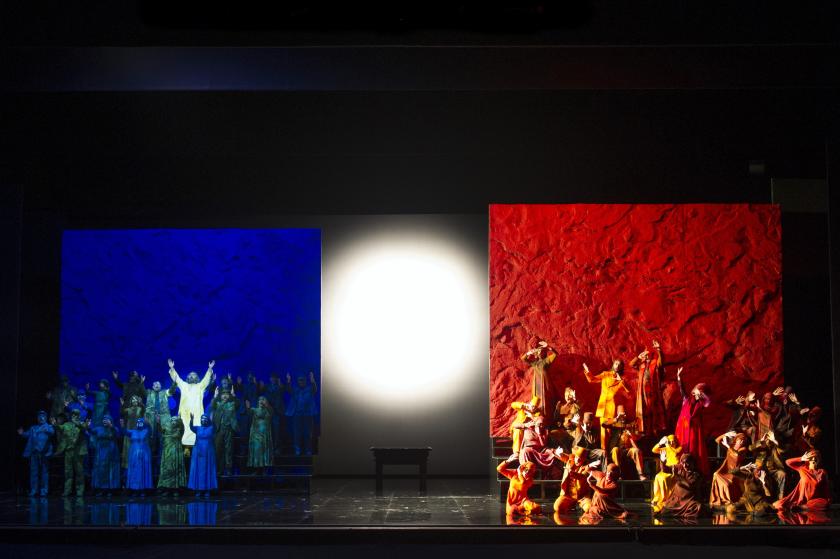 WNO do the work proud. David Pountney’s and designer Raimund Bauer’s staging – though, as with the apple in William Tell, it fudges the most sensational effect: the parting of the Red Sea – is beautifully devised in general as a visual correlative of the basic elements of the plot. Famously, the curtain goes up on total darkness (the first plague), but as light returns the colours slowly emerge in blue-green fatigues for the Hebrews, red and orange for the Egyptians, divided left and right, like the Sharks and Jets in West Side Story, but modern dress only up to a point, with antique nuances: Moses in a long white robe, Pharoah with headdress. All is finely harmonized, with costumes by Marie-Jeanne Lecca and lighting by Fabrice Kebour.