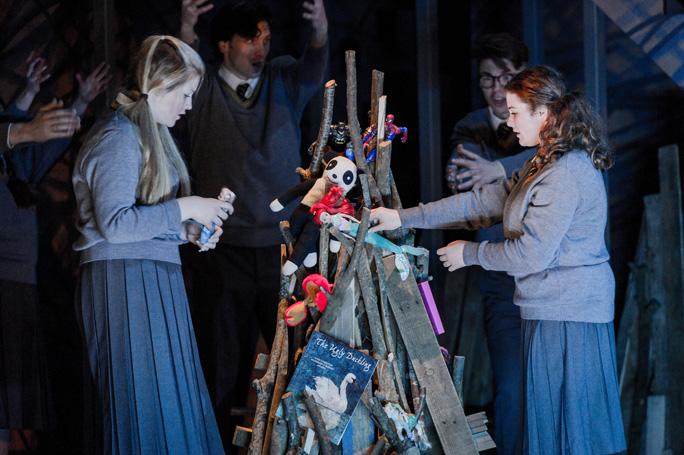 This is one of many areas where the libretto plays safer than the novel; Teller makes the "sacrifice" the much more horrifying one of the other kids digging up the coffin of Ursula's young brother to add to the pile (an old dog guarding its master's grave gets involved in the ritual too). Oddly Maxwell prefers to stick to stereotypes – all the boys at first choose superheros and action-men models to throw on the "pile of meaning", the girls select girly things – whereas Teller extends the participants to include an effeminate boy and a Muslim who gets beaten black and blue at home for having to hand over his prayer mat. This part of Sussex, needless to say, is less multi-culti than provincial Denmark, so the representation on stage is also less mixed, to put it mildly.