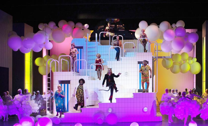 Lez Brotherston’s costume designs and Lizzie Clachan’s set for Mount Olympus are the best things about the evening. The mobster gods live on a luxury cruise ship in the sky and Cupid wears gold hot-pants. Tom Morris’s lyrics are always lively, often clever and sometimes snarky. And there are pleasing touches: balloons of varying sizes magically become sheep and bees, and Orpheus and his guide, Public Opinion, rise to Mount Olympus in a balloon-borne London taxi.