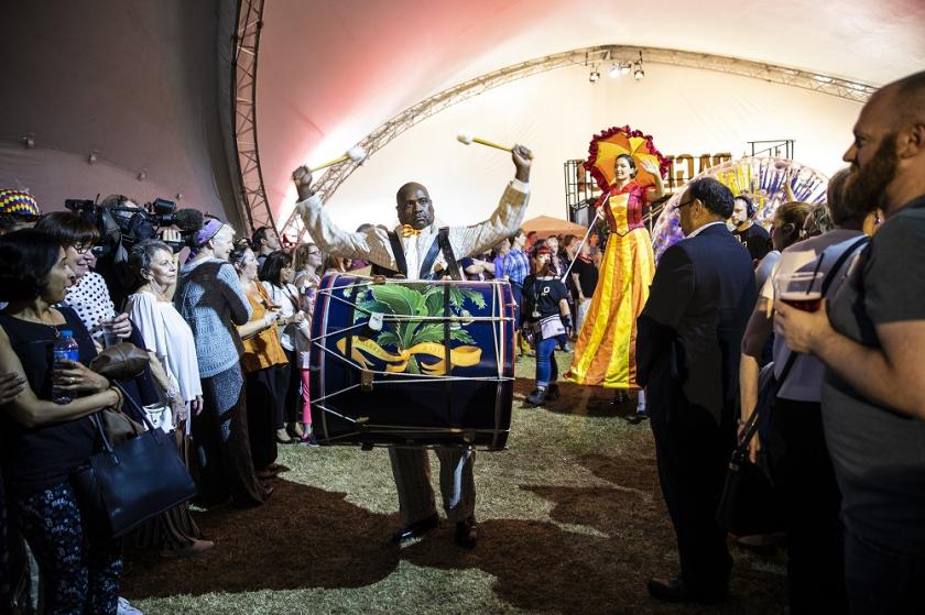 At its heart, Bill Bankes-Jones's production sought to be fun for everyone involved. The pre-show entertainment featured magicians, a Punch and Judy show, face-painting and even boxes of novelty hats for people to wear. I donned a policewoman’s cap, while my friend wore a beret made of something resembling astroturf with a golf tee in the centre and a miniature golf ball swinging from a string; sadly, the queue for the face painting was a bit too long. At this stage, Scottish Opera’s Music Director Stuart Stratford introduced the orchestra, whose players sat, in civvies, on the only bit of staging that looked like an actual stage. Members of the crowd were invited to have a shot at conducting the orchestra, adding to the friendly, laid back feel of it all.