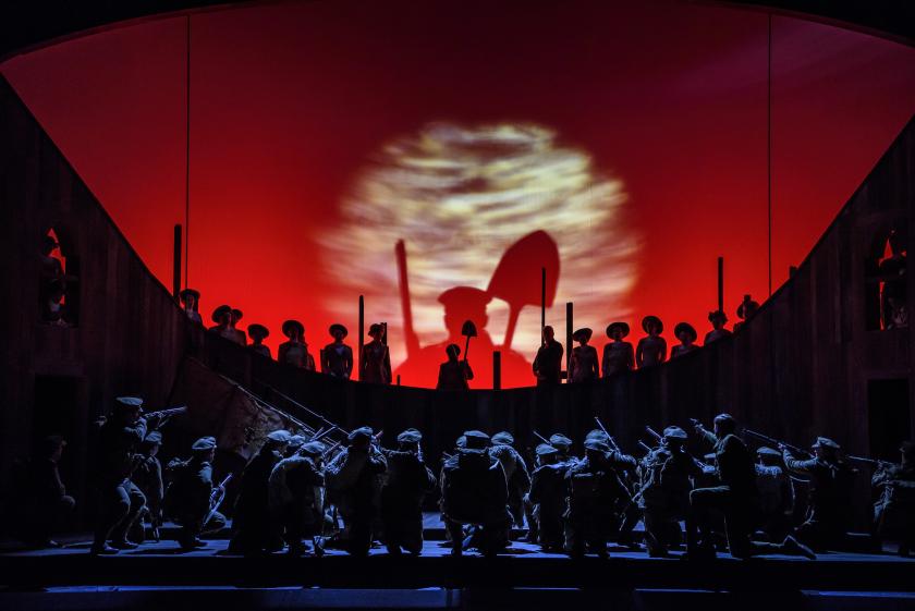 The big textures that mostly predominate are, I suppose, a natural outcome of the wide-angle approach to the subject. They focus on solid, occasionally brilliant, choruses on a crowded stage peopled, in David Pountney’s production, not only by soldiers but by what the librettists call a Greek-style “soundscape” chorus of women (Bacchantes?), who later reappear as the blasted Mametz trees of the familiar imagery, and later still as the “regenerated” forest, with Albert Herring flowery hats, all cleverly, even wittily, designed by Robert Innes Hopkins.