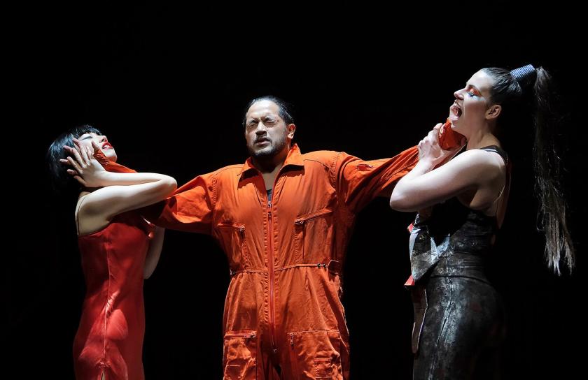 So much is counterintuitive that in Act One, you can't help thinking of how much more concisely and dramatically Britten tells the Phaedra story in his 15-minute monologue for mezzo. Here the pleasures have to rest in some ravishing music for instrumental couples – the clarinets of the Southbank Sinfonia are especially impressive – and the stylish delivery from the remarkable latest acolytes of the Royal Opera's Jette Parker Young Artists Programme. The Phaedra, stage natural Hongni Wu, sounds more coloratura soprano than mezzo. The impression, as in the recent Linbury production of Handel's Berenice, is that Jacquelyn Stucker, dominatrix Aphrodite, is conversely more mezzo than soprano, though she hits the heights with stunning aplomb: further confirmation that a star is born. Tongan-New Zealander tenor Filipe Manu will be perfect in Britten, and has some of Henze's most text-conscious lyric lines. First counter-tenor of JPYAP Patrick Terry as pure Artemis has to battle against the punchiness of Henze's fleshy chamber-ensemble but offers some golden moments. A shame the mostly silent role of the Minotaur means we don't hear more from true bass Michael Mofidian (pictured below with Manu and Terry).