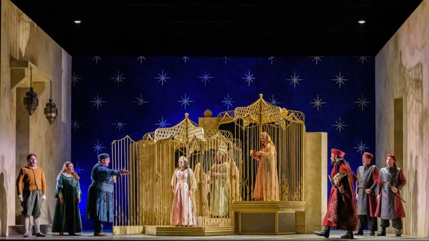 The set is a single rotating unit, on one side Osmin’s gatehouse, a Hans Sachs-style workshop, and on the other a harem, a complex of large gilded cages. And that’s plenty for telling this story. Osmin’s lair has a large table which doubles as a bed. A lot of the third act is taken up with duets, where the lovers are separated by bars, for which the cages serve. The only omission is a balcony, for Belmonte’s rescue attempt. In the event, he and Pedrillo perform a comedy routine with the ladder he brought for the job, but they end up forcing the lock to the cage instead.