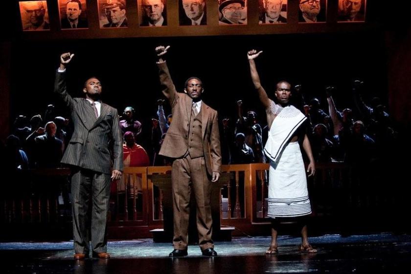 The second act jumps to Sophiatown in 1955. I think this is the highlight of the show. Composer Mike Campbell, Professor of Jazz at the University of Cape Town, draws on township jazz to bring Mandela’s political and personal lives together. The score includes popular songs of the period including Pata Pata and Baby Ntshware plus an onstage trumpeter who is surely the young Hugh Masekela. There are protests against the forced removals of blacks from Sophiatown, a vibrant community of 50,000 people. “Despite its poverty, Sophiatown had a special character,” writes Mandela in Long Walk to Freedom, “for Africans it was the Left Bank in Paris, Greenwich Village in New York. It was both bohemian and conventional, lively and sedate.” Mandela is vacillating between peaceful and armed struggle and, as an attractive young freedom fighter, he has competing female admirers. The truth is simplified here to Evelyn, his wife and mother of his children; the singer Dolly Rathebe with whom he’s having an affair; and the future Winnie Mandela, whom he met around this time. While flirting with all three, it’s the political campaign that preoccupies him. The style here is musical theatre with singable melodies and dramatic song and dance numbers.