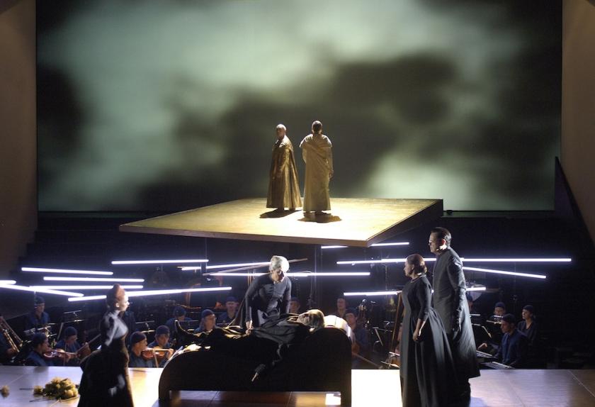 This action takes place, so to speak, on a higher plane, upstage behind the orchestra, itself relocated by the director, Pierre Audi, in a temporary pit on the stage side of the footlights. Downstage, in front of the orchestra, Wagner suffers and dies, attended by his wife Cosima, the doctor, and the young English singer Carrie Pringle, all unaware of the Buddhist action and baffled by Wagner’s conversation with it. Harvey (pictured below) allots these “real-life” parts to speaking actors, playing here in German; the Sieger drama is sung in Pali, the language of the Buddha himself. The sense of distance, of unworldly remoteness, is total. The vocal setting of this almost-lost language kept reminding me of Stravinsky’s Abraham and Isaac, with its text in Hebrew, a language of which Stravinsky knew not one syllable but which he set with a haunting sense of its ritual significance.