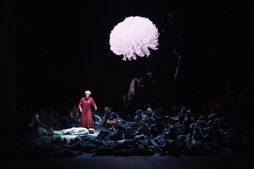Giant LED screens frame the stage – pages of a book that open up to reveal the living history they describe. Tillmans combines historical material – a 1920s anti-war publication full of horrifying photographs, an appeal for the victims of Srebrenica – with his own photos. There are angular shots of the bombed-out ruins of Coventry Cathedral and some gurning football rioters, but mostly what we see is nature: branches split open, their bark peeling off like flayed skin, sea-spume blowing along a beach like the froth of mustard-gas, the lumpen shapes of logs covered in moss, nature’s fallen bodies. The suggestions are delicately done, giving us both horror and its transformative redemption in a single image – a gesture that comes to a climactic head in a moment of snowfall. In that sudden flare of white we see both mushroom cloud and nature’s blessing, wedding veil and shroud.