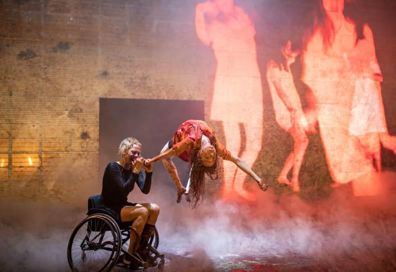 Van Hove has been here before, in Paris, presumably with the Belgian actor Hélène Devos, a perfect image of degradation, hopefulness and malice (pictured above seated). The physical representation of her crucial encounter with the mother she’s not seen for so long is superbly handled: maternal tenderness cut short by the question of long-absent Orestes’ return (the brother eloquently played by Minne Koole).