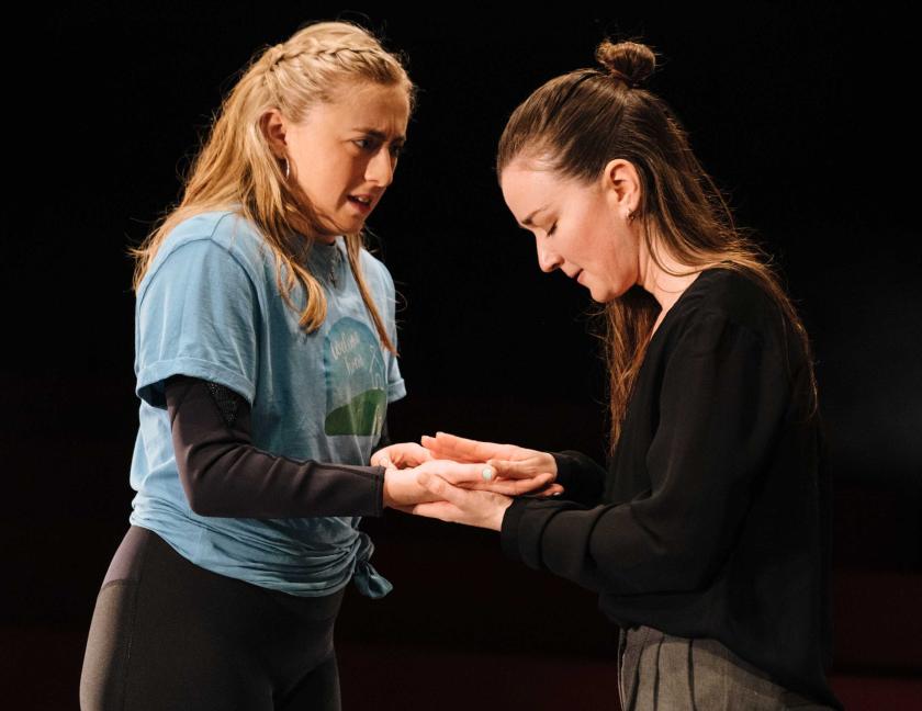 Reading the script after the performance, I was immediately struck by its literariness. Even the stage directions reach odd heights of abstraction. The first one calls for the opening to express: “The vastness of space. The noise of everything.” By the last scene, this noise has to be turned up “so loud, we might not be able to hear them [Gillian and Kelly]”. Well done to sound designer Beth Duke for tackling that one so well.