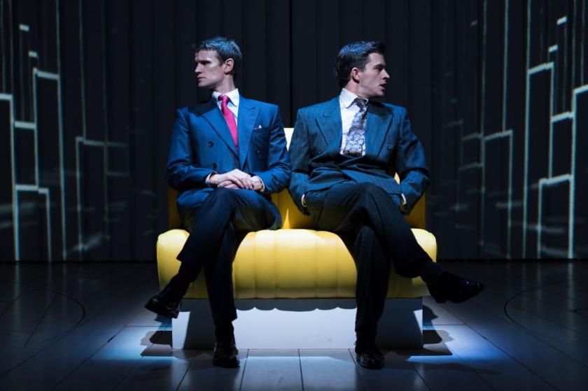 In acting terms, Smith's performance is a marvel, proffering an increasingly anxious and self-loathing narcissist who, far from meeting his comeuppance, represents just the sort of unknowable charmer who may walk among us still, attracting both sexes along the way (pictured left, Smith and the excellent Hugh Skinner as Bateman's closeted colleague, Luis). The ensemble as a whole function both as the grasping citizenry of a particular time and place and as a series of sharply individuated turns, with Katie Brayben, Susannah Fielding, and Cassandra Compton all outstanding as three women willingly drawn into the web of a seducer who parades his absence of affect to anyone who will listen. I mean, would you turn away someone who lays claim to having a "severely impaired capacity to feel" when he looks so good in (and out of) a suit?