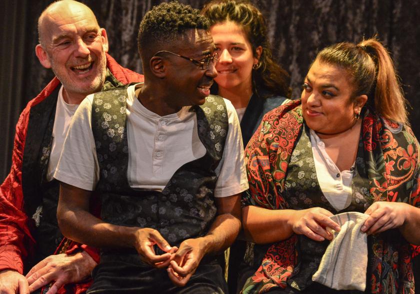 This warm, teasing rapport between cast and audience is built on throughout, as if we are at a cabaret where the aim is to have maximum fun. Audience participation isn’t called on, but you sense there would have been a rush if it had been. Running the show onstage is a sort-of MC (Martin Hyder), who weaves his way through the plots, as ageless as a vampire. “I am the spirit of entertainment,” he announces in one of his incarnations. Inventively running the show in a bigger sense is director Tom Jackson Greaves, working to a translation by Waleed Akhtar.