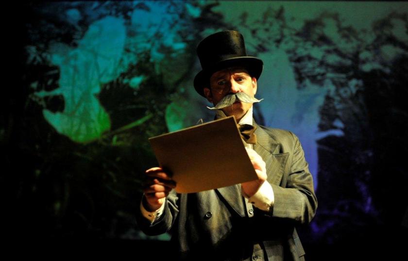 Doyle’s story is presented here as an illustrated lecture by PhD student Jennifer McGreary (Gabriel Quigley), aided by two hapless hired actors, Javier (Javier Marzan) and John (John Nicholson). It’s a slightly stodgy device, but wittily realised, enabling the play to leap back and forth between the past and present, the real and imagined, and allowing Jennifer to converse with Conan Doyle, as well as some choice Sherlock Holmes cases to be brought hammily to life. Woven in between is a farcical, fictionalised account of the inner workings and internal tensions of the theatre company itself, fresh from a 52-date Highland tour which has clearly taken its toll. Often, one scenario elides into the other, as when a table-top tussle between Moriarty and Holmes on Reichenbach Falls rapidly descends into a battle between John and Javier for the heart – and a few other bits – of Jennifer.