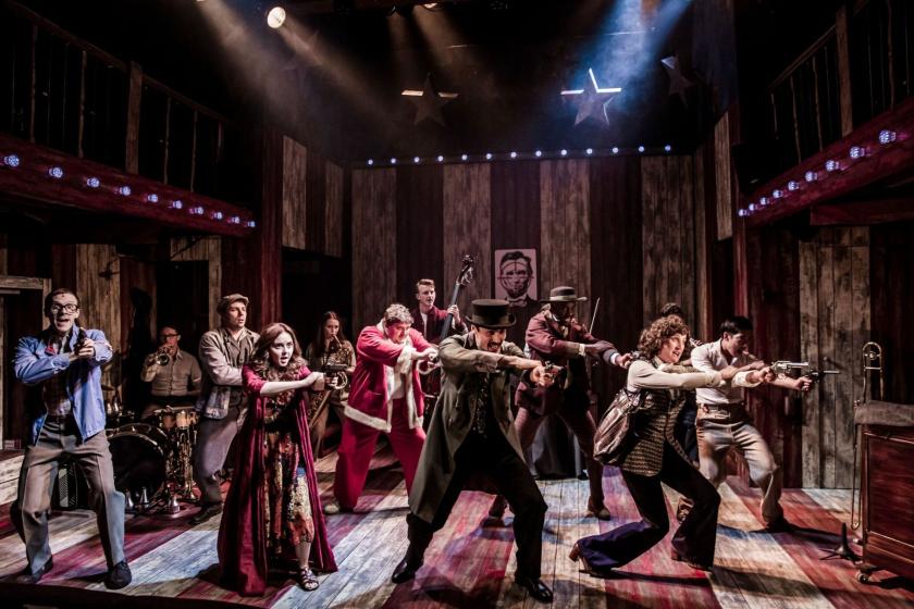 This is an “actor-muso” production, meaning that the cast double as their own orchestra, though not every actor and not all the time. The result under Catherine Jayes's ever-expert musical supervision has an aptly rough-and-ready sound for a show that shines a sharp and often satiric spotlight on a line-up of presidential killers – some successful, others not – whom you can just imagine pooling their disaffection at a Trump rally. And although the women tend to outshine the men vocally – Sara Poyzer, a longtime veteran of Mamma Mia!, is a revelation as Sara Jane Moore, who kept a lethal eye set on Gerald Ford – I won’t soon forget the wild-eyed intensity of Alexander Mugnaioni’s Julius Caesar-quoting John Wilkes Booth. Or Steve Simmonds as the Nixon-hating Samuel Byck, who in 1974 attempted to crash a hijacked plane into the White House in an eerie harbinger of 9/11.