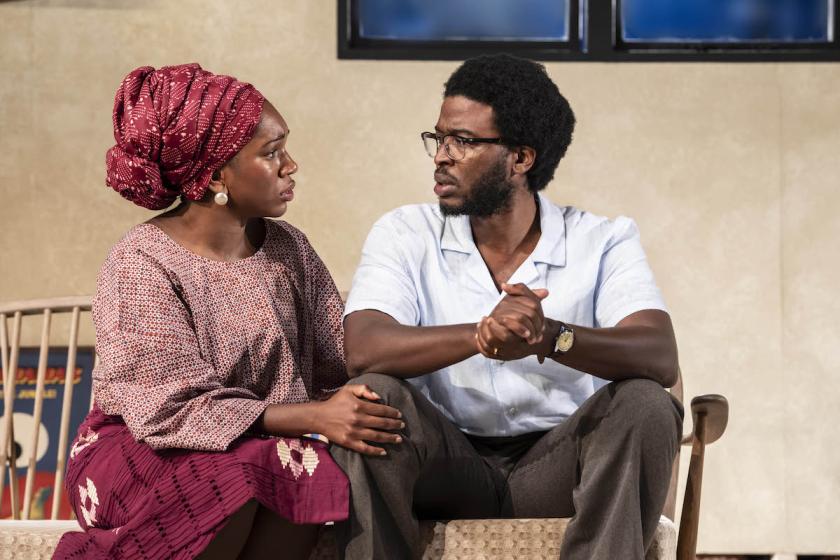 Designed by Debbie Duru, the playwright’s production of his work – which premiered in rep with Clybourne Park at Baltimore’s Center Stage, when he was artistic director there – is powerful, often comic, but also rather static. It’s an uneven play, but this revival features a dignified and commanding central performance by Cherrelle Skeete as Beneatha, who ages convincingly, and is well served by the rest of the cast which play two roles each: Zackary Momoh (Asagai/Wale), Sebastian Armesto (Daniel/Mark, pictured above with Skeete), Tom Godwin (Nelson/Gary) and Nia Gwynne (Mrs Nelson/Harriet). Jumoké Fashola gets some good laughs with her portrayal of Aunty Fola. At its best, the play is a panoramic satire which engages thought-provokingly with Hansberry and Norris.