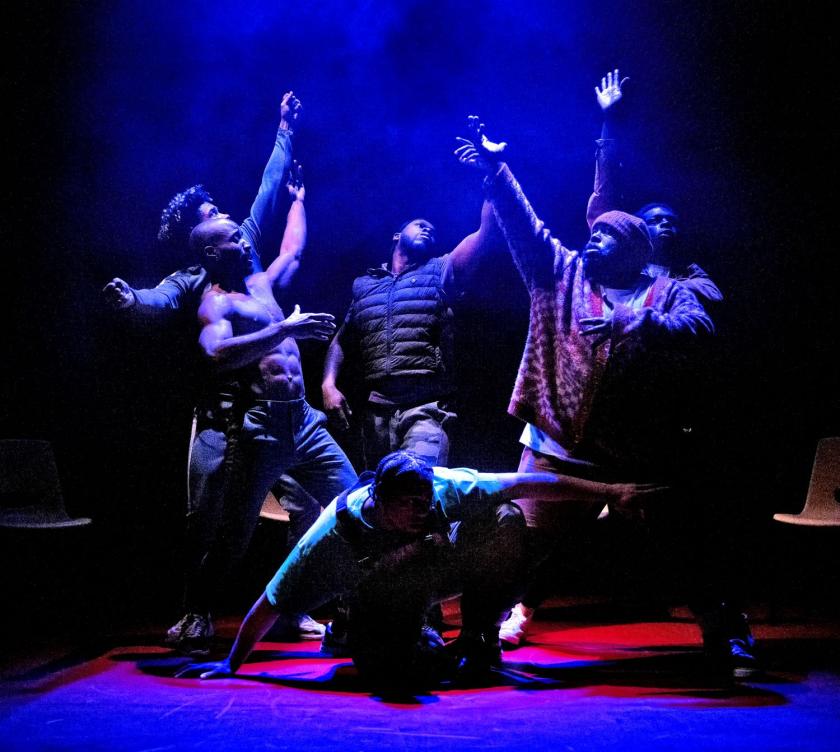 The characters are named for shades of black, for the heavy hue they can’t set down. There’s anxious Pitch (Emmanuel Akwafo), academic Obsidian (Aruna Jalloh), flirty Sable (Darragh Hand), boisterous Midnight (Kaine Lawrence). In bits and pieces, through jokes and rap and rhythm, the boys show their soft underbellies: lack of confidence, low self-esteem, childhood sexual abuse. Onyx (Mark Akintimehin) is the least interested in being vulnerable – or at least, he seems that way at first. His intimidating swagger only cracks when he and Jet begin to act out each other’s father-son dynamics, and it becomes clear just how badly Onyx was treated as a child.