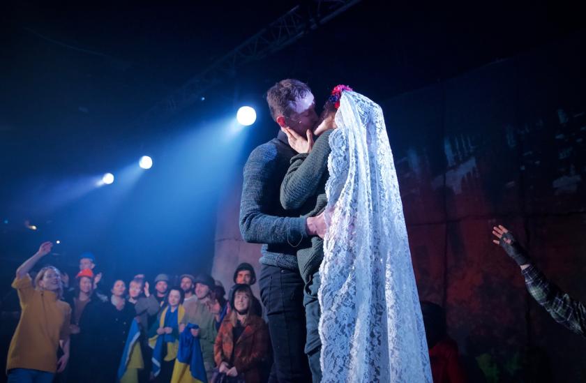 How do you express this theatrically? With much sound and fury, according to this production from Belarus Free Theatre, an organisation that understands better than most the relationship between the suppression of free speech and the spilling of blood. At the heart of the action is the real-life love story of Mark and Marichka Marczyk, one a Ukrainian-Canadian, one a pure Ukrainian, who met on the barricades. As Westerners, we are invited to join this from the perspective of Mark, a gluten-intolerant dumpling-phobe, who pitches up in his ancestral country after a lengthy journey, only to find himself invited to rewrite the future.