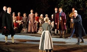 It seems perverse that a play about language should be brought so clearly into focus by the use of silence, but this is what Timothy Sheader’s production manages so effectively. Onstage throughout are 15 young girls. Clad in their Puritan best, they sit scattered about the grassy periphery of the main set, physically punctuating the space. Hands clasped, heads bowed, their white bonnets catch the fading light, drawing the eye to the slightest movement. A silent Greek chorus whose sole role is to respond, their simple miming gestures are performed in epic unison, magnifying their emphasis ten –or fifteen – fold. It is the contrast between the silent passivity of these mute observers and the terrible and potent agency that the play ascribes them that turns the dramatic screw of this production. Their constant presence draws attention precisely to their glaring absence within the text – the perpetual cipher at the heart of the play.