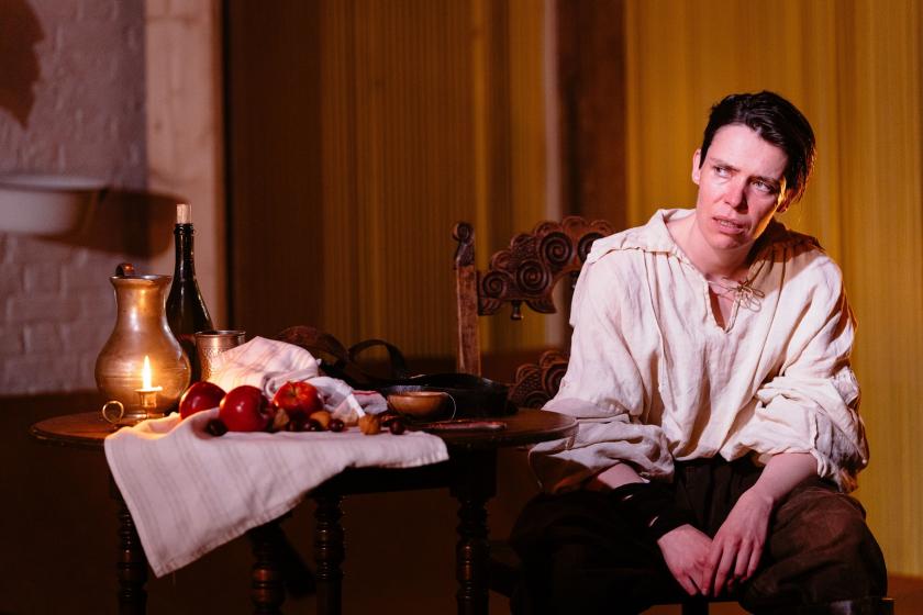 The fact that the cast comes through with distinction is despite rather than because of the production. Emma D’Arcy has an intimate power as Elizabeth Proctor, and there's a later quiet intenstity to Sorcha Groundsell as Mary Warren (their prim visages would look at home in the original Salem setting). As Judge Danforth, who's made into a compilation character here, Jacob James Beswick controls the court with bureaucratic efficiency, dominating those over whom he presides; prime among them is Nina Cassells’ Abigail, convincingly complicated elsewhere but hampered by having to play out her secret meeting scene with Proctor via hand microphone (pictured above).