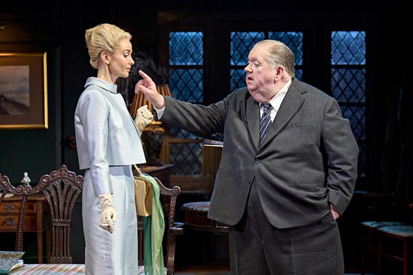 Meanwhile, two other figures have come on stage, which now doubles as the faux cottage across the Atlantic. This time it’s Hedren (Joanna Vanderham) who knocks at the door, to be greeted by Hitchcock (Ian McNeice), these actors perfectly manifesting their physically distinctive real-life characters – he the dramatically rotund, smugly assured veteran director, she the latest, icily beautiful incarnation of a “Hitchcock blonde”.