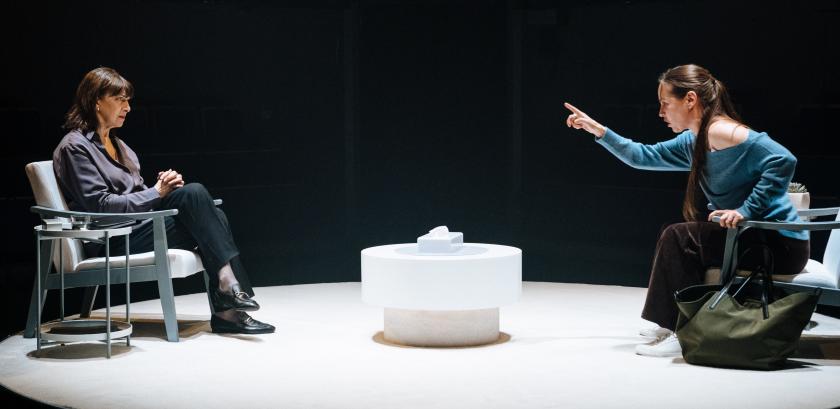 On the shrink’s-office set are the traditional two easy chairs, separated by a low table with the standard-issue box of tissues. But this set slowly revolves, so the audience on all four sides of it can get an adequate grasp of the actors’ faces. On the balcony above, a violinist (Kath Roberts at the performance I saw) plays lyrical, echoing music (composed by Oliver Vibrans) whenever Stephanie arrives for a session with Feldmann: we see her checking herself when she hears the music and stopping to listen intently before she enters.