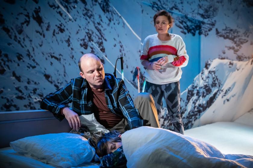 That doesn’t really happen. The way the tensions between the central married couple affect their children (Florence Hunt and Henry Hunt on the night I went, very good) is plausible and sustained. But wife and mum of two Ebba, the excellent Lyndsey Marshall, has a scene with a woman who faces her with the alternative of a guilt-free open marriage (Nathalie Armin) in which the issues vanish once raised. The main tension is in Ebba’s attempts to squeeze the truth from husband Tomas (Rory Kinnear). In this and much else she’s less than sympathetic – and that may well have been Östlund’s point, that too much is expected of the male in a conventional family role.