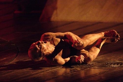 On stage an amniotic membrane stretched across a circular frame begins to bulge and strain, until finally it bursts open, disgorging the Creature. Naked, half-bald and and criss-crossed with crude stitching, he is an unsettling sight – if scarcely as horrifying as the response of those who later encounter him would suggest. Slowly, agonisingly at first, he finds his feet, stumbling and wobbling like a toddler before eventually breaking into a delighted run. One glance from his maker, in an all too cursory first scene between them, is enough to convince Victor Frankenstein to cast out the misshapen fruit of his labour (in both senses of the word, given the birthing imagery); and the Creature rushes out into a world that quickly proves hostile.