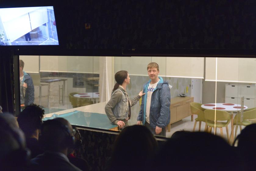 Once inside, we are each given a set of headphones and seated on benches, which are arranged on the four sides of a newly built house somewhere near Liverpool. In front of every block of spectators is a rectangular blind, and three small CCTV screens. Are you ready? Let Game begin. The blinds rise, and we find ourselves peering through the “fourth wall” into the living room, kitchen, bedroom and bathroom of the home of a young couple, Ashley and Carly. As in Big Brother, we can see and hear everything. Just.
